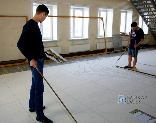 - Из маленького эскиза всё переносится на большой холст, разделённый на квадраты, каждый из которых метр на метр, – рассказывает Алексей Амбаев, - Сформировав ткань, будем переносить рисунок, закладываем основной цвет, расставляем пятна, уточняем детали, объём, светотень и получается красота.