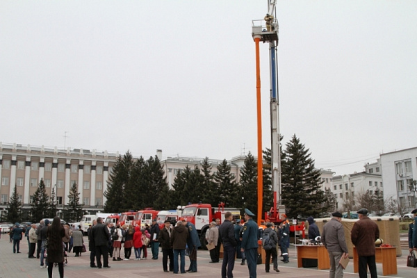 После торжественного собрания на площади Советов состоялся показ пожарно-спасательной техники и специального оборудования – новые образцы снаряжения, «куб жизни», спасательный рукав для эвакуации людей из верхних этажей.