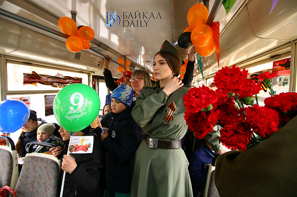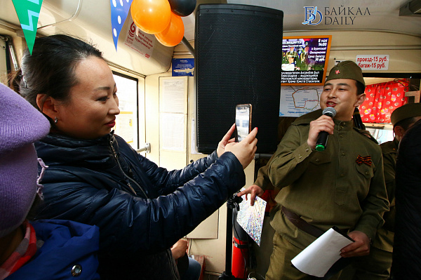 Пассажиров в празднично украшенном вагоне встречали артисты, исполнявшие военные песни. Улан-удэнцы пели вместе с исполнителями Тимуром Болотовым, Эдуардом Будажаповым, Анной Парамоновой, Сергеем Затворницким, Баиром Касьяновым, Сандыком Цыбеновым.
