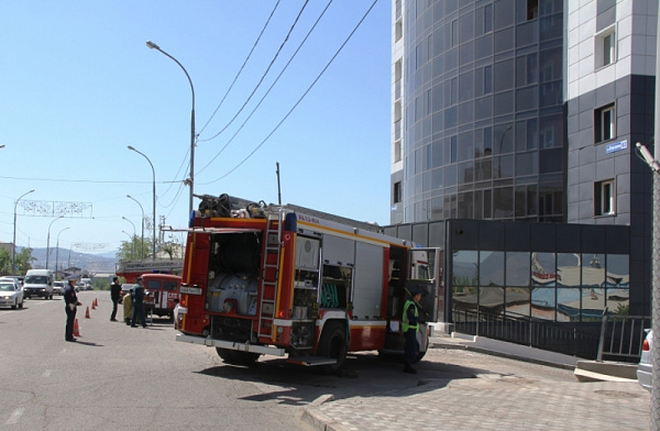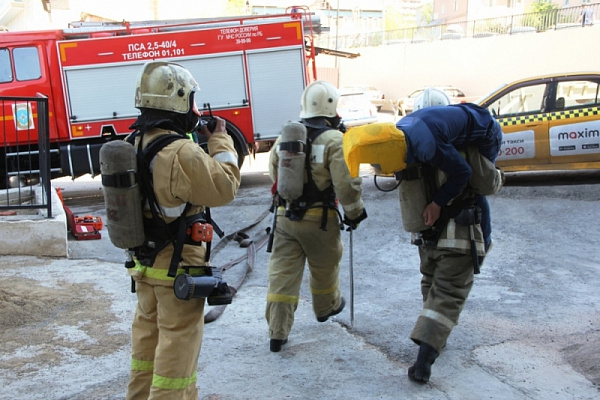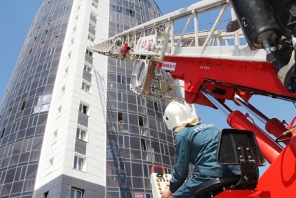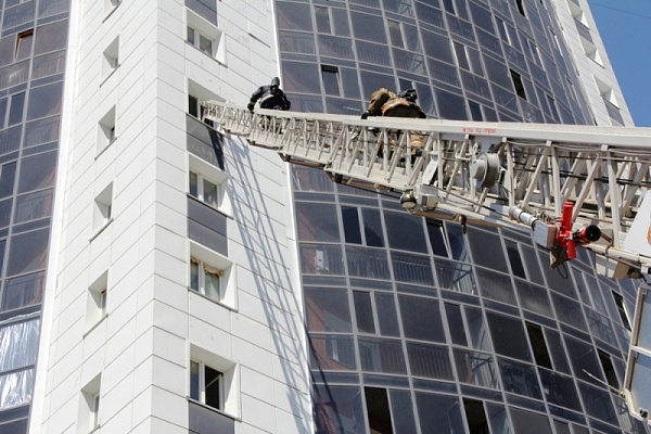 По легенде учений, на четвертом этаже высотки произошло возгорание, о чем очевидцы немедленно сообщили в пожарно-спасательную службу.