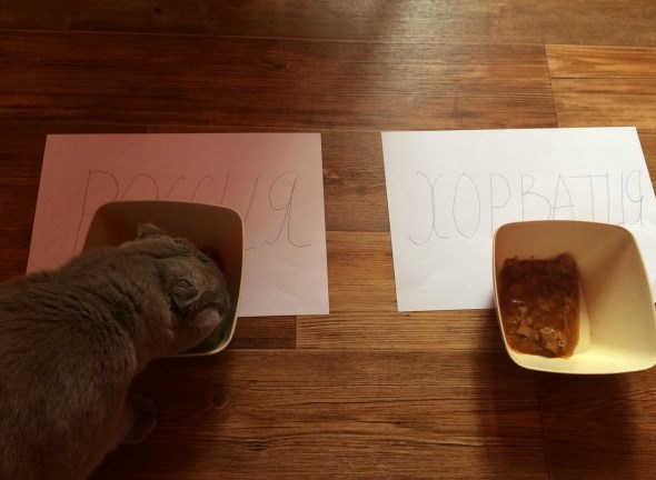Перед котом поставили две миски с кормом. Под каждой них были надписи с названиями стран «Россия» и «Хорватия». На 6-ти секундном видео серый кот уплетает корм из миски, под которой лежал листок «Россия».