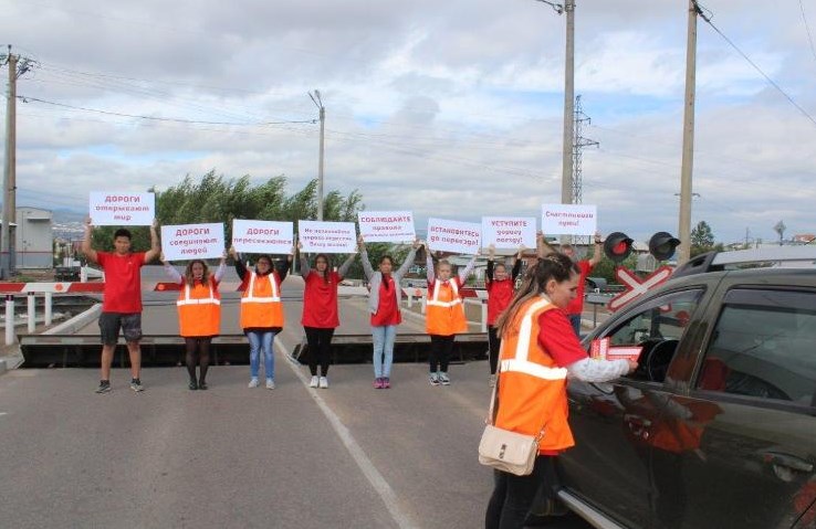 В минуты временного закрытия шлагбаума участники флэшмоба вставали лицом к водителям, держа в руках пластиковые таблички со словами: «Дороги открывают мир. Дороги соединяют людей. Дороги пересекаются. Соблюдайте правила дорожного движения! Остановитесь до переезда! Уступите дорогу поезду! Не позволяйте дороге пересечь Вашу жизнь! Счастливого пути!»