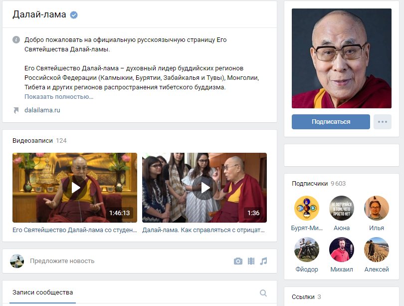 Официальная страница «ВКонтакте» появилась у духовного лидера буддизма Далай-ламы XIV. Его страницу ведёт Фонд содействия сохранению культурных и философских традиций тибетского буддизма «Сохраним Тибет» под духовным руководством Тэло Тулку Ринпоче по согласованию с офисом Его Святейшества Далай-ламы.