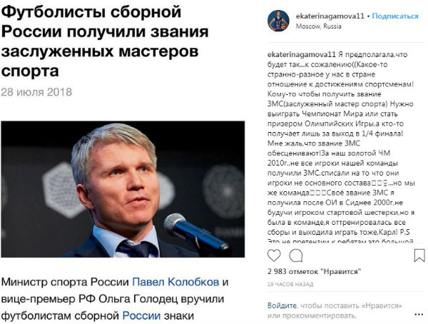 Присвоение званий заслуженных мастеров спорта футболистам вызвало неоднозначную реакцию в спортивной среде. Двукратная чемпионка мира по волейболу Екатерина Гамова в посте в Instagram раскритиковала это решение: