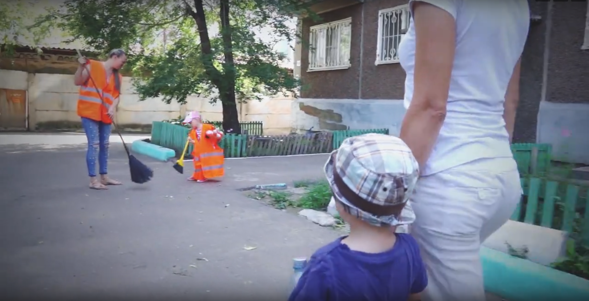На видео показывают, как дети ходят на работу с мамами – стоят за прилавками магазинов, подметают дворы, продают квас.