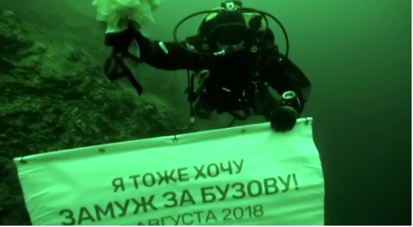 Оказавшись на дне озера Сергей развернул плакат с надписью «Я тоже хочу замуж за Бузову» и помахал большим букетом цветов.