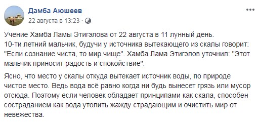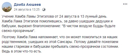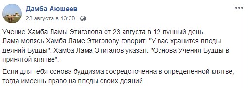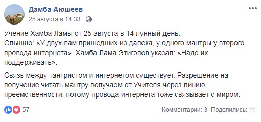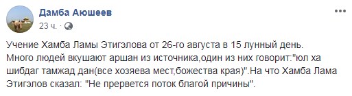 «Учение Хамба Ламы от 25 августа в 14 лунный день. Слышно: «У двух лам пришедших издалека, у одного мантры, у второго провода интернета». Хамба Лама Этигэлов указал: «Надо их поддерживать», - написал Дамба Аюшеев.
