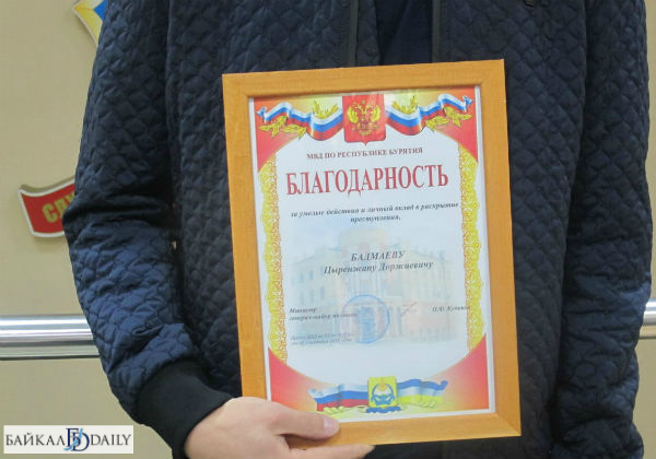 Сегодня отважного парня наградили в управлении МВД России по Улан-Удэ. Цыренжапу вручили благодарность от имени министра внутренних дел по Бурятии Олега Кудинова.
