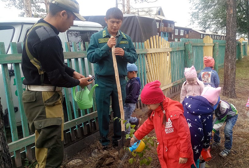 В рамках акции «Живи, лес» в детском саду «Малышок» Курумканского района лесники высадили с детьми саженцы березы. Ребята поливали деревца и разговаривали с лесничими о значимости деревьев в природе. Малыши задавали сотрудникам Курумканского лесхоза и лесничества самые различные вопросы, например, почему листья зелёные, почему они желтеют осенью и высказывали свои предположения.