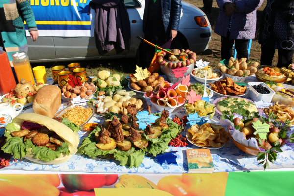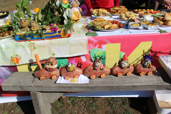 В широком ассортименте были представлены блюда из картофеля, поделки из овощей, картофель необычной формы и «картофель–богатырь», домашняя выпечка, мёд, домашние заготовки, мясо баранина, говядина, зерно, овёс, дроблёное зерно.