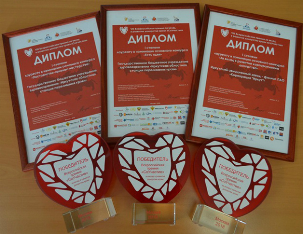 На конкурс премии было подано свыше 350 заявок из 52 регионов страны. Иркутская областная станция переливания крови стала победителем сразу в двух номинациях премии «СоУчастие». Проект под названием «Регулярные ответственные доноры Приангарья» признан лучшим в номинации «Постоянство – признак мастерства». Проект реализуется для увеличения количества кадровых доноров в Приангарье. Второй проект - «Знаки отличия донорства молодёжи» - победил в номинации «Есть идея!» за лучшую практику в области безвозмездного донорства крови и её компонентов. Проект организован для привлечения и популяризации донорского движения среди молодёжи Иркутской области.