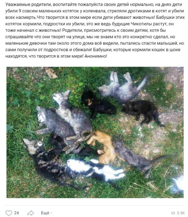 В качестве иллюстрации женщина выбрала фотографию убитых котят, лежащих на зелёной траве. Люди начали активно возмущаться происходящему, многие были в шоке от фотографии.