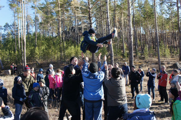 Для многих детей это восхождение было первым в жизни, поэтому отцы по традиции трижды подкинули новичков в воздух, под рукоплескания остальных детей и крики «молодец». Прежде чем отправляться вниз, все перебрались на заснеженную часть сопки, с азартом поиграв в снежки.