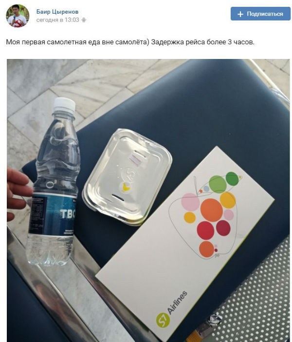 Одним из «заложников непогоды» стал депутат Народного Хурала Баир Цыренов. Он опубликовал фото воды и питания, которое предоставили пассажирам в связи с задержкой рейса.