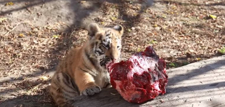 Судя по видеозаписям в соцсети Барнаульского зоопарка, у Ермака Шерхановича отменный аппетит. Работники запечатлели один из обедов тигрёнка.