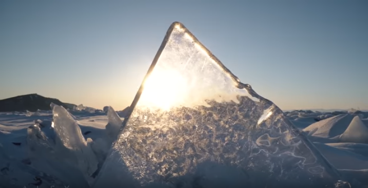 Зимнюю сказку Байкала Alex начал показывать с прозрачно-голубого льда озера. Главный восторг вызывает его прозрачность. Благодаря чистейшей воде озера, лёд имеет голубоватый оттенок, порой даже ярко-голубой, почти синий. На ролике можно увидеть популярные Байкальские ледовые пещеры, глыбы льда высотой с дом и трещины.