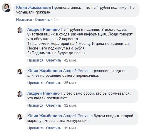 Перевозчики сделали лишь небольшую уступку для жителей. Как сообщал «Байкал-Daily», изначально повышение тарифа планировалось сразу на 9 рублей – до 37-ми. Это вызвало волну протеста в Сотниково, где практически все жители работают в Улан-Удэ. В пятницу вечером состоялся 2-часовой сельский сход, на котором жители приняли решение не повышать цену на проезд. Впрочем, решение сельского схода перевозчик выполнять не обязан. Власти также не могут повлиять на ситуацию, так как перевозки по маршруту Улан-Удэ – Сотниково отданы частникам, работающим по нерегулируемому тарифу.