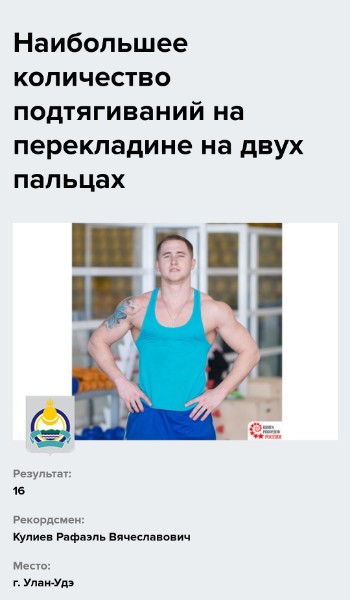 23-летний улан-удэнец попал в Книгу рекордов России. Он установил рекорд по подтягиваниям за один подход на двух пальцах. Рафаэлю Кулиеву удалось подтянуться 16 раз.