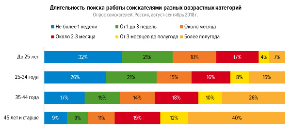 Кроме этого, в ходе исследования выяснилось, что с возрастом время, затраченное на поиск работы, возрастает, и в 40% случаев этот процесс может занимать более полугода, в то время как вероятность найти работу в течение одной недели к 45 годам составляет всего 9%.