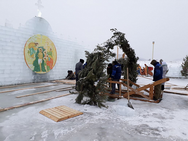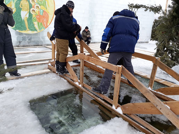 Также будет обустроен городок с ледяными стенами, в котором можно будет переодеться, попить чай, покушать горячие блюда, изготовленные в монастыре. Кроме того, будет обустроена иконная лавка, где можно приобрести крестики, духовную литературу, иконы. Здесь же можно помолиться перед погружением, поставить свечи.