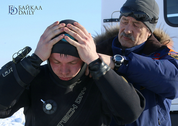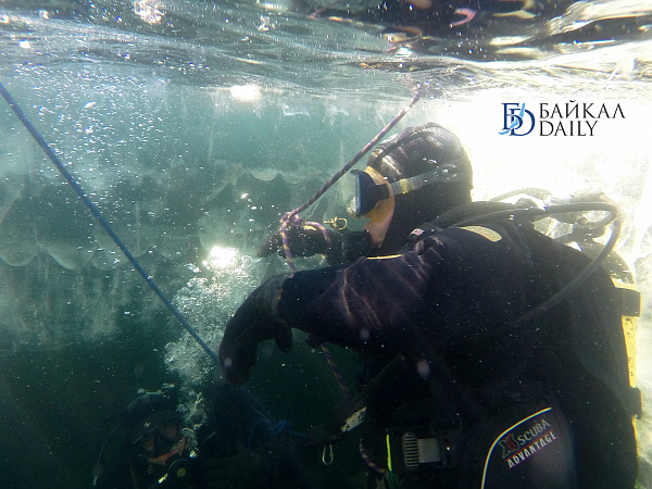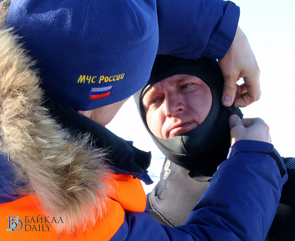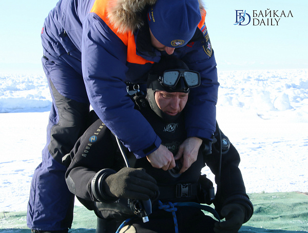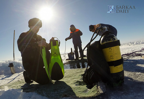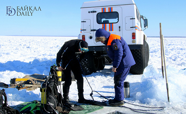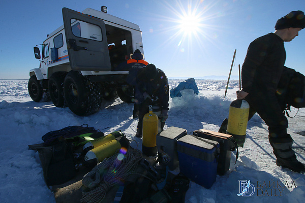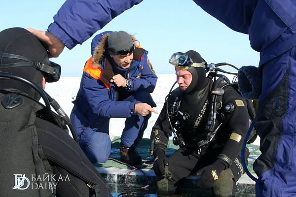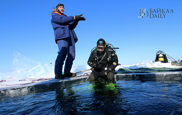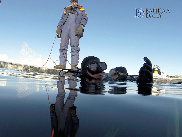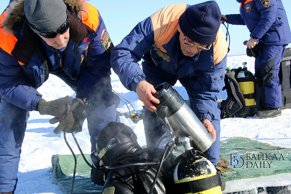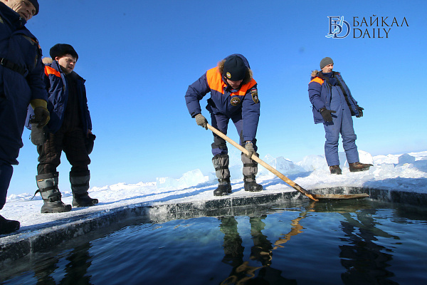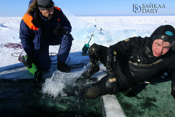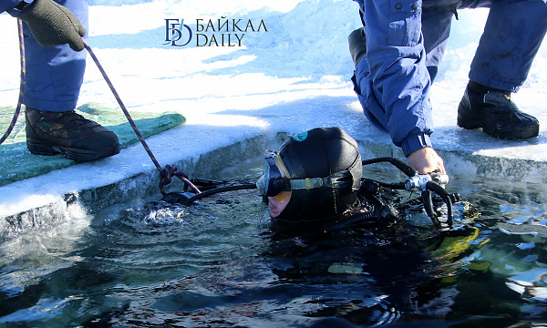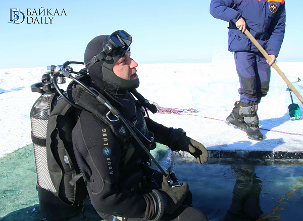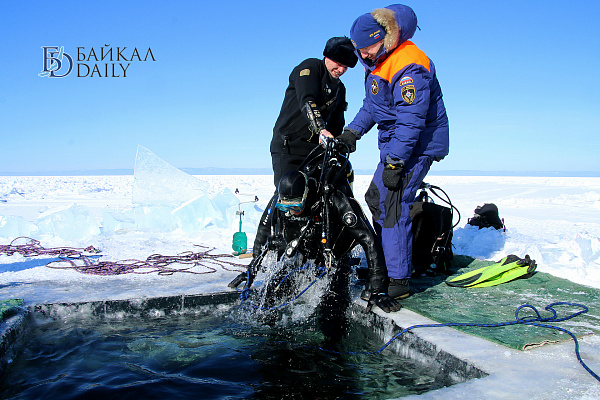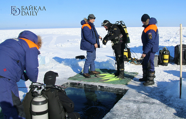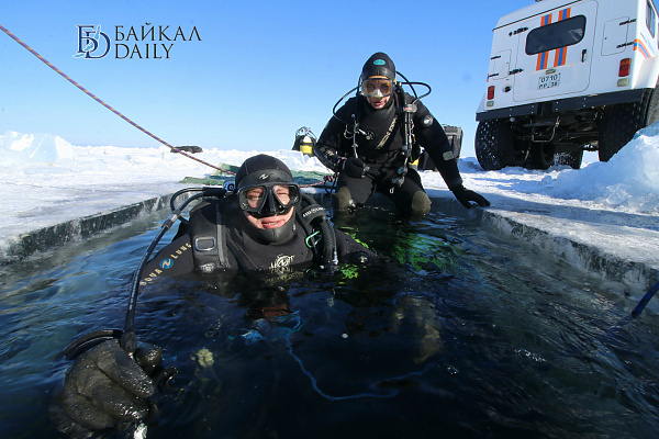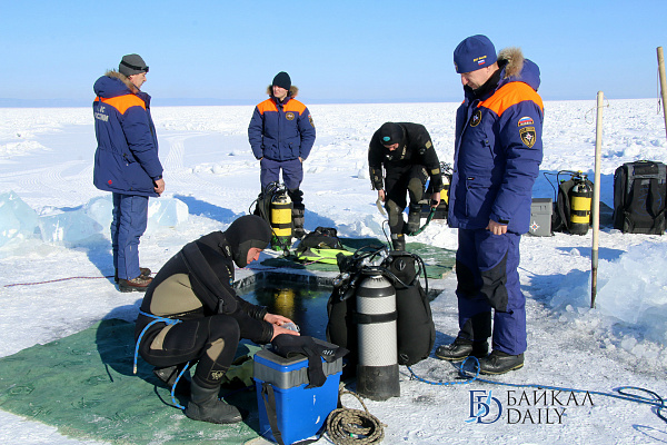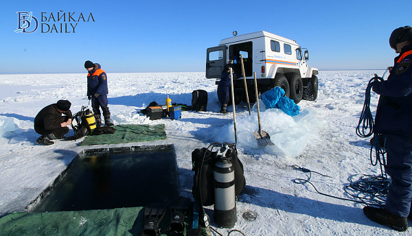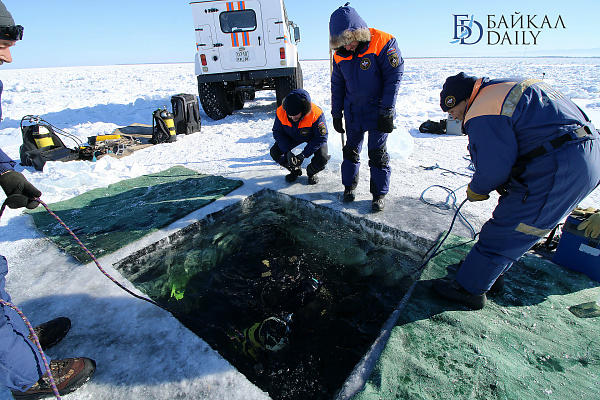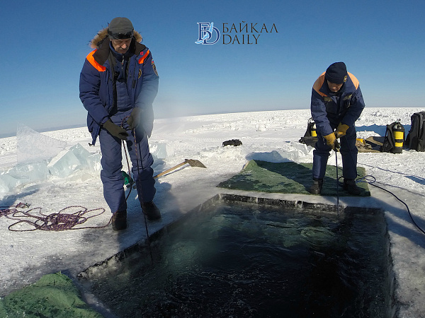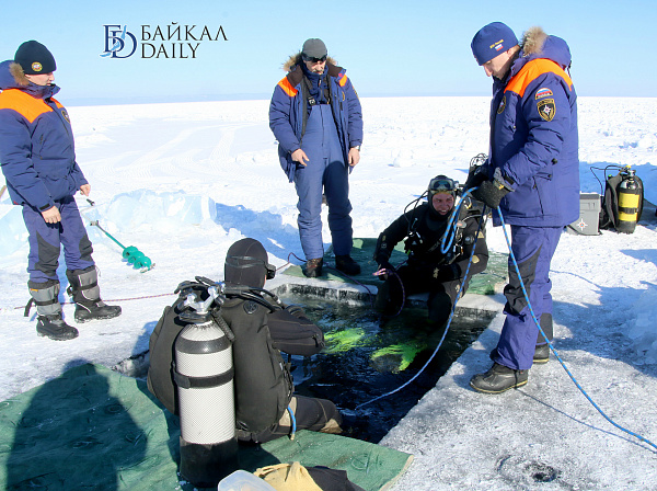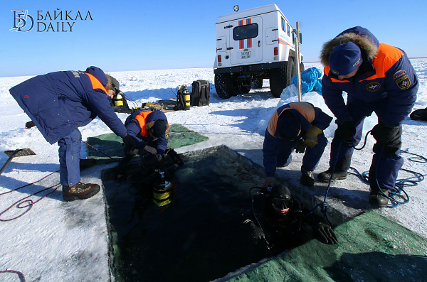Спасатели отрабатывали водолазные спуски подо льдом Байкала. Водолазы оттачивают навыки подводных работ в условиях низких температур.