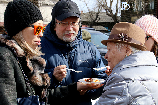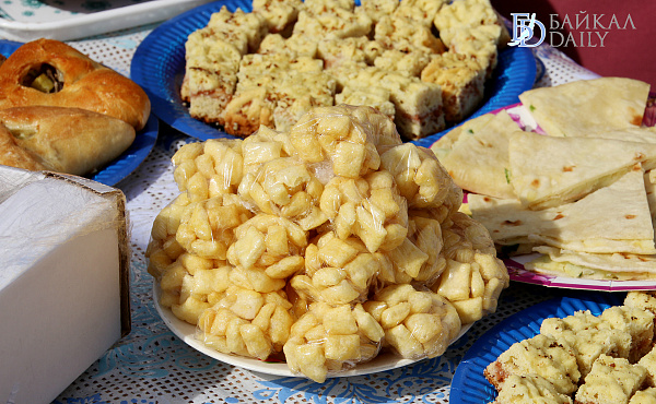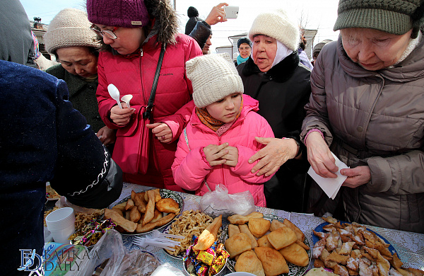На площадке перед Домом дружбы расположился восточный Дастархан. Здесь можно было попробовать блюда национальных кухонь: узбекский плов, киргизские лепешки с кунжутом и кумыс, азербайджанские халву сумоляк, пахлаву, шакербуру, татарский чак-чак, казахский баурсак.