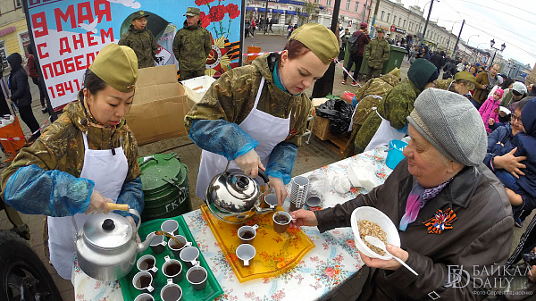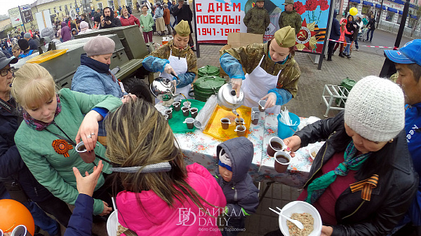 Улан-удэнцы отведали «Солдатскую кашу», участвовали в акциях «Рекорд Победы» по отжиманию и толканию гири, пели песни военных лет.