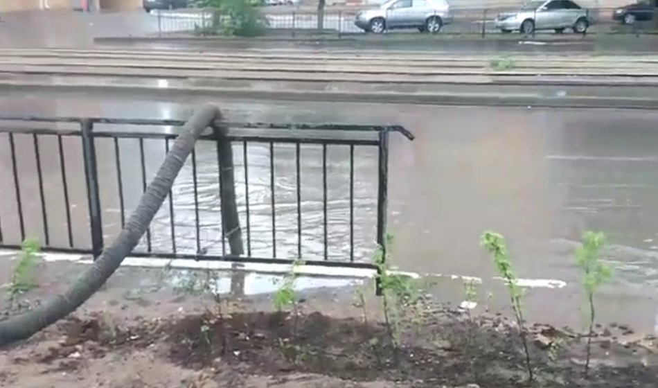 Этим летом лужа на Боевой уже успела доставить неудобства горожанам, она образовалась после небольшого дождя в начале июня. На месте тогда работали коммунальные службы и откачивали воду помпой.