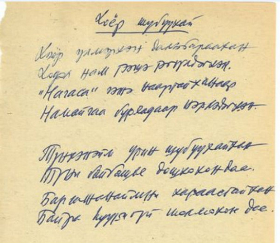 В 80-х годах Гунга Чимитов написал трогательное стихотворение о своих внучках «Хоёр шубуухай», но по разным причинам оставил его неизданным.