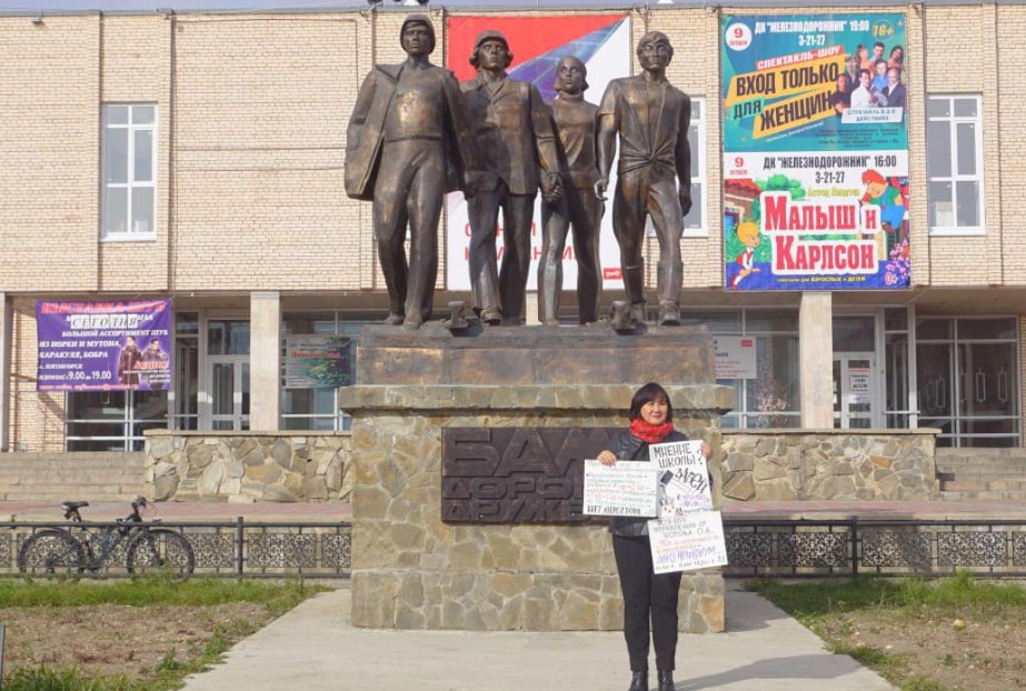 Депутат Народного Хурала Оксана Бухольцева, уволенная с поста директора школы №11 в Северобайкальске, устроила очередной одиночный пикет. Акцию протеста она провела в родном городе в день учителя, 5 октября.