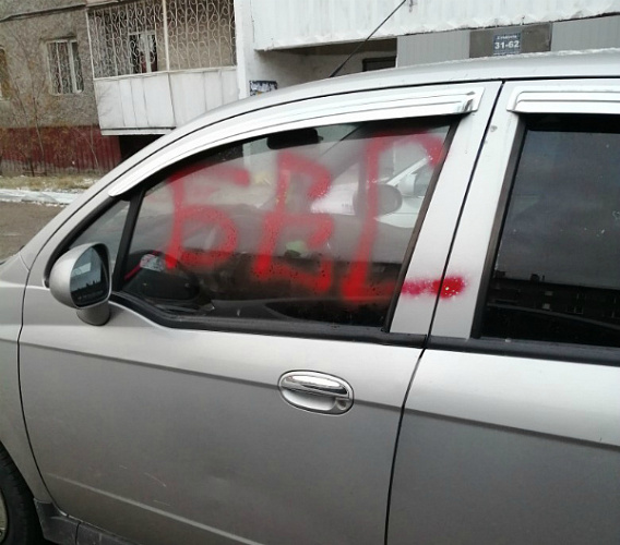 В бурятском паблике «Аноним 03» появилась фотография очередной мести. Некто нанёс надписи на припаркованный автомобиль. На стёклах иномарки написано «Бес», а также матерное слово.