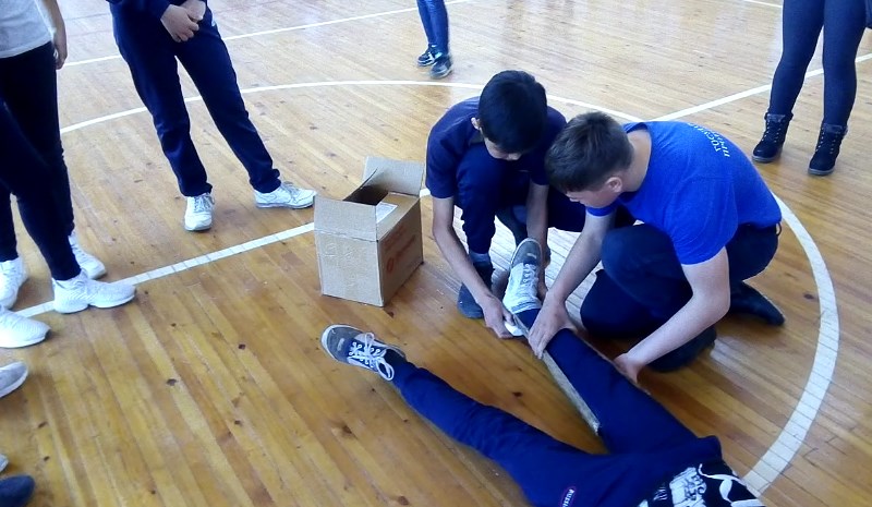 Мероприятие плавно переходило к зрелищной части: на следующем этапе ребята на скорость надевали боевую одежду пожарных, демонстрировали элементы боевого развёртывания, вязали спасательную петлю и оказывали первую доврачебную помощь «пострадавшему», накладывая шину на перелом.