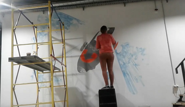 Также показан небольшой процесс создания рисунка. Художники наносят рисунок на стену. Для того, чтобы подняться к потолку, используются строительные леса.