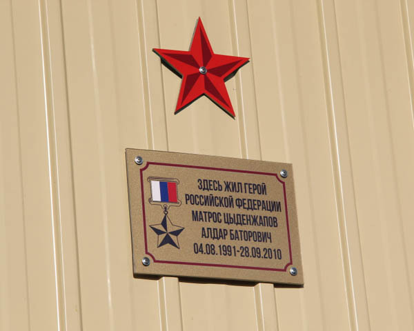 Агинцы вместе с представителями «Боевого братства» собрались у дома, где жил Алдар Цыденжапов, где почтили его память и установили пятиконечную звезду и придомовую табличку, которые привезли гости из Республики Бурятия.
