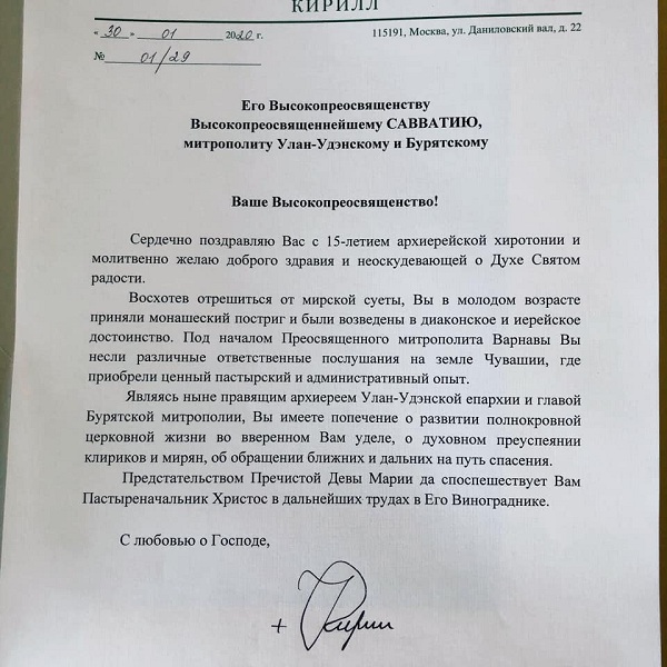Сегодня, 30 января, митрополит Улан-Удэнский и Бурятский Савватий отмечает 15-летие архиерейства. Его поздравил патриарх Московский и всея Руси Кирилл. Официальное письмо с поздравлением от патриарха бурятский митрополит разместил у себя на странице в соцсети.