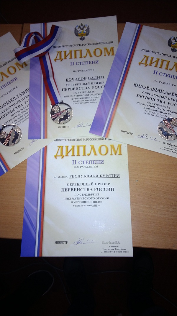 На первенстве России в городе Ижевск по пулевой стрельбе бурятские спортсмены в Олимпийском упражнении «Стрельба из пневматического пистолета пп-60м» заняли второе место. Республику представляли Александр Кондрашин, Вадим Бочаров, Тамир Бадмаева.