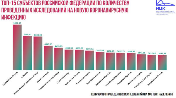 На первом месте Сахалинская область с результатом 9 057,95 исследований на 100 тыс. населения, далее следует Москва – 6 786,41 – и Ямало-Ненецкий автономный округ – 6 693.