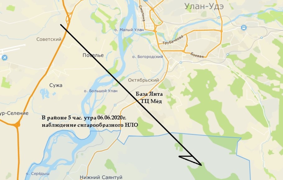 В Улан-Удэ в ночь с 5 на 6 июня двое местных жителей увидели в небе неопознанный летающий объект. В настоящий момент администраторы паблика «Бурятия. Аномальные и паранормальные явления» Вконтакте ищут других очевидцев загадочного явления.
