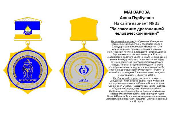 - Этой медалью мы планируем награждать медицинских работников, водителей служб скорой и неотложной помощи, работников немедицинских отраслей, которые также были задействованы в борьбе с новой коронавирусной инфекцией: строителей, сантехников, электриков в госпиталях. Безусловно, это и наши волонтёры, которые в трудное время проявили себя наилучшим образом. В общем, всех, кто помогал и спасал. Ситуация с коронавирусом на самом деле показала, сколько у нас хороших, отзывчивых людей в республике, - отметил глава Бурятии Алексей Цыденов, обращаясь к участникам конкурса.