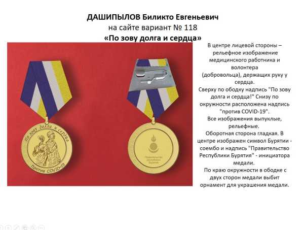 В Бурятии подвели итоги конкурса на лучший макет медали за борьбу с новой коронавирусной инфекцией. Медалью, которая приравнена к госнаградам, будут отмечать медицинских работников и вспомогательный персонал, задействованный в борьбе с COVID-19.