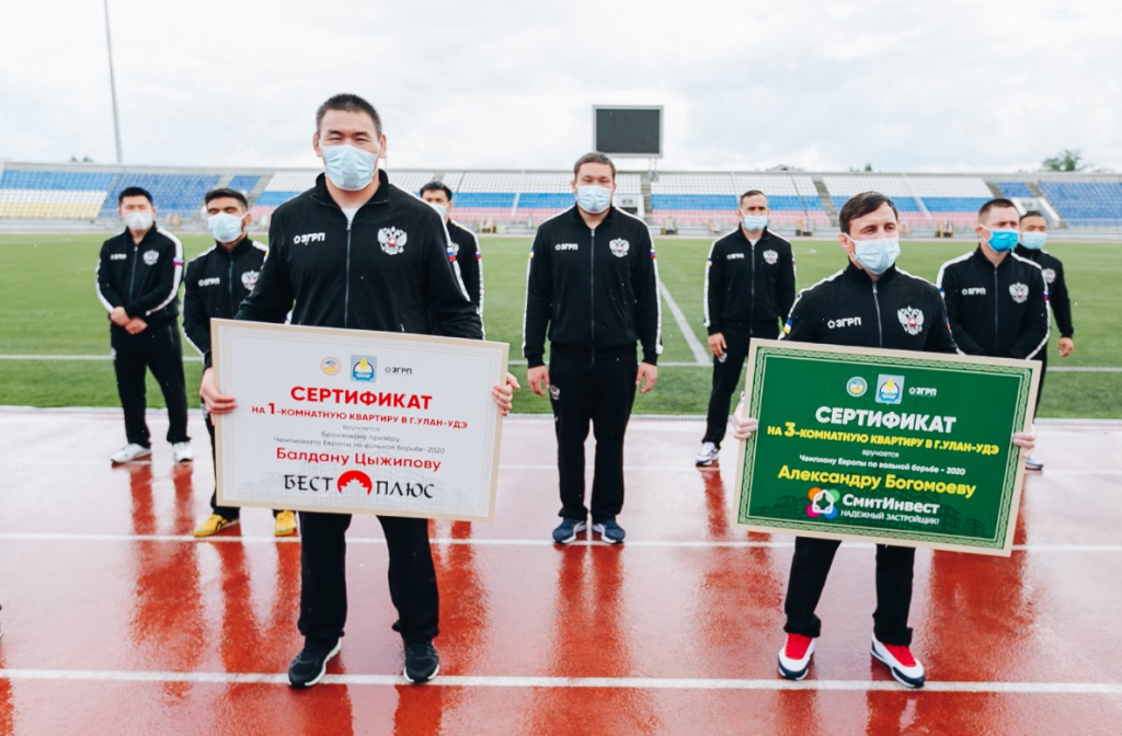 Борцам Александру Богомоеву и Балдану Цыжипову, завоевавшим золотую и бронзовую медали чемпионата Европы-2020, вручили сегодня на Центральном стадионе жилищные сертификаты. Богомоев станет обладателем трёхкомнатной квартиры, Цыжипов – однокомнатной.