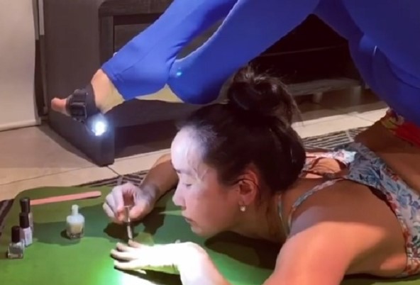 Небольшое видео начинается с того, что Баярма подпиливает себе ногти. Затем выясняется, что она лежит на животе, а фонарик прикреплён к ноге. В таком поразительном положении она красит ногти. Затем Баярма в прежнем положении берёт ногу руками и делает на ней педикюр.