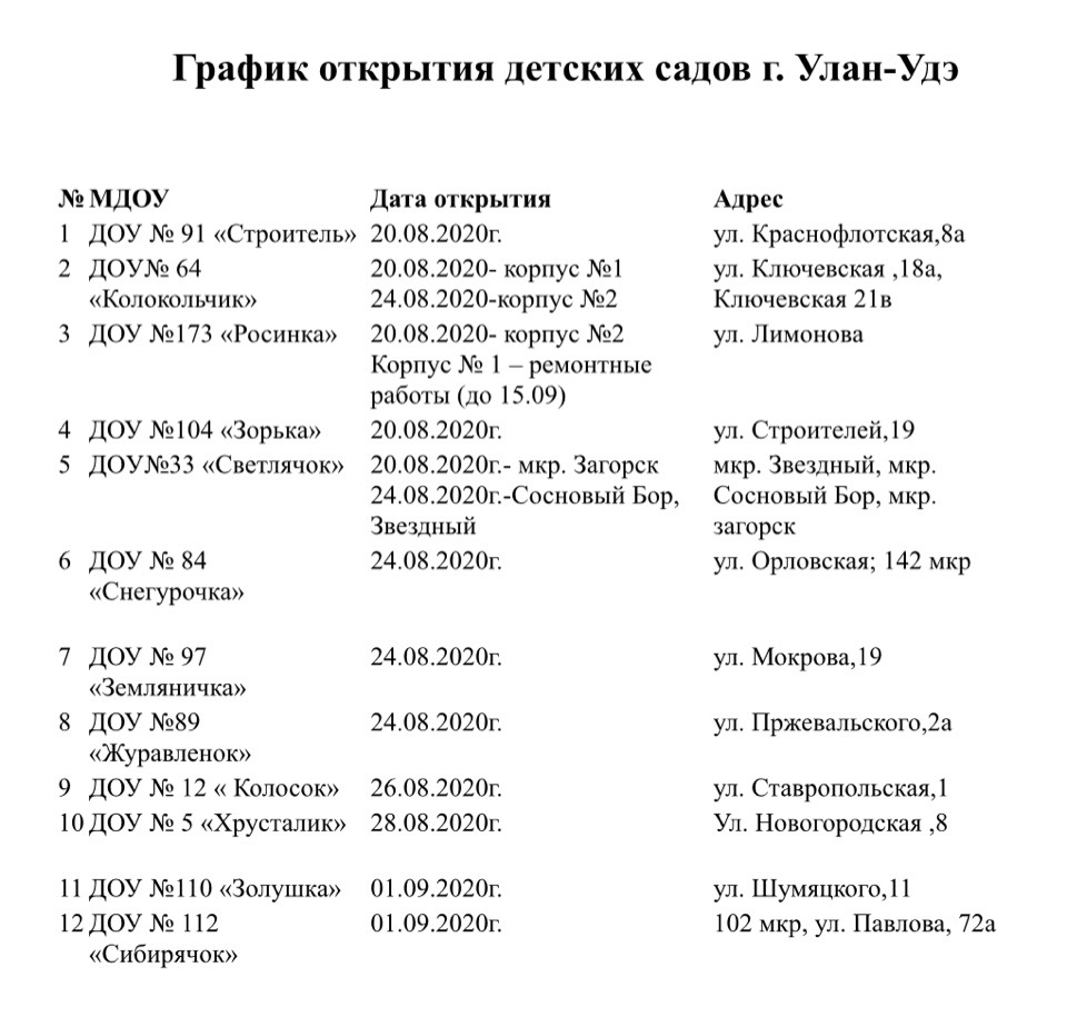 График открытия детских садов Улан-Удэ с 20 августа следующий: