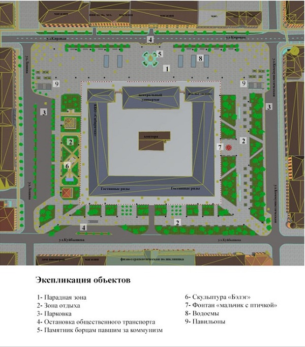 Проект разработал авторский коллектив двух дизайнеров-архитекторов Ксении Гадецкой и Мыдыгмы Бальжинимаевой. В мэрии объяснили, что этот проект «отличается бережным отношением к сложившейся градостроительной планировочной структуре исторической застройки», имеет «оптимальное функциональное зонирование территори», «максимально сохранит зелёные насаждения», а задуманная идея «реально выполнима».