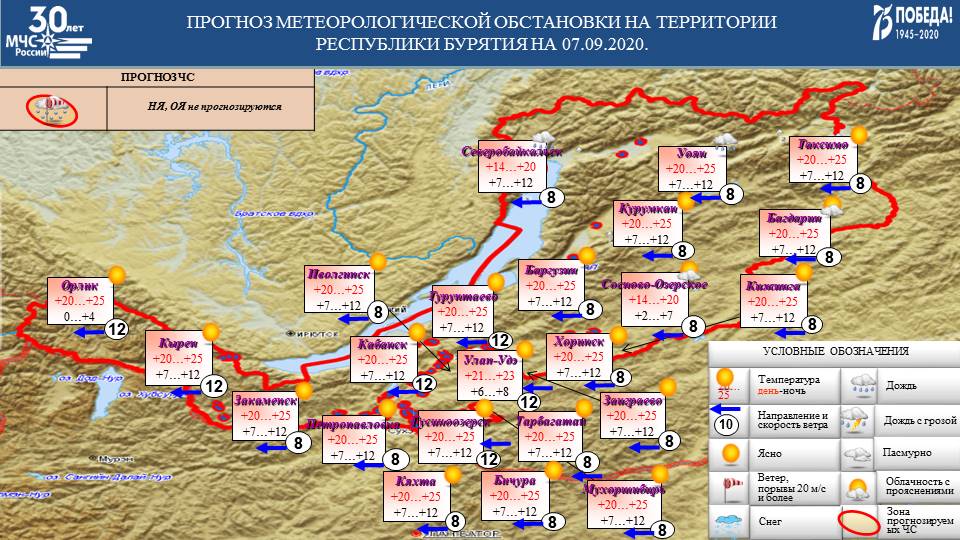 По данным Бурятского Гидрометцентра, сегодня, 7 сентября, в республике переменная облачность, без существенных осадков, утром при прояснении туманы. Ветер восточный 3-8, утром и днём в отдельных районах до 12 м/с.