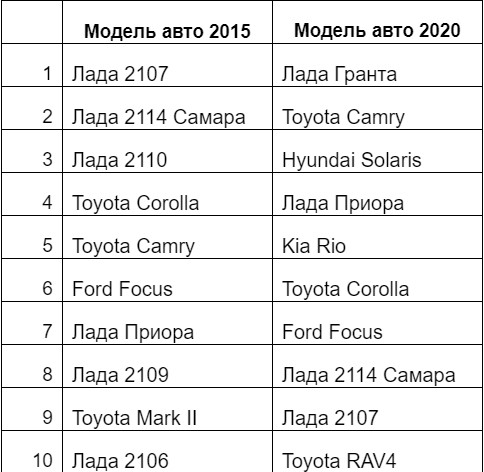 Всероссийский топ-10 в продаже автомобилей на Дроме за 2015 год и 8 месяцев 2020 года выглядит так: