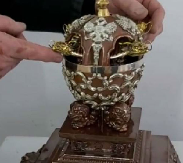 Произведение сделано наподобие яйца Фаберже, но внутри находится модель буддийской ступы.