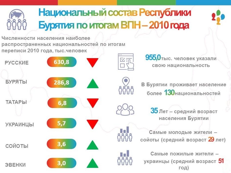 По итогам переписи населения 2010 года, наиболее многочисленными в республике национальностями стали русские, с численностью 630,8 тыс. человек, и буряты, с численностью 286,8 тыс. человек. Численность русских, по сравнению с 2002 годом, снизилась на 34,7 тыс. человек, или на 5,2 %, в то время как численность бурят, напротив, увеличилась на 13,9 тыс. человек или на 5,1 %.
