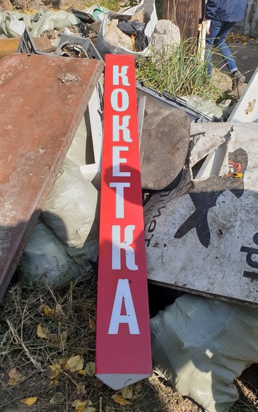 По его словам, рекламная надпись «Кокетка» лежала на свалке. Рядом с «Кокеткой» валялась старая расчёска и пустые бутылки от пива.