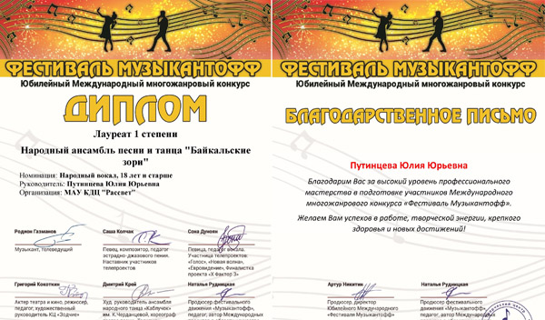 Народный ансамбль песни и танца «Байкальские зори» КДЦ «Рассвет» города Улан-Удэ также получил приглашение на юбилейный конкурс. По итогам мероприятия коллектив стал лауреатом 1 степени в номинации «Народный вокал» в возрастной категории «18 лет и старше». Благодарственным письмом также была отмечена руководитель ансамбля Юлия Путинцева. Об этом сообщает пресс-служба городского комитета по культуре со ссылкой на ансамбль.